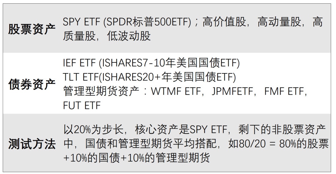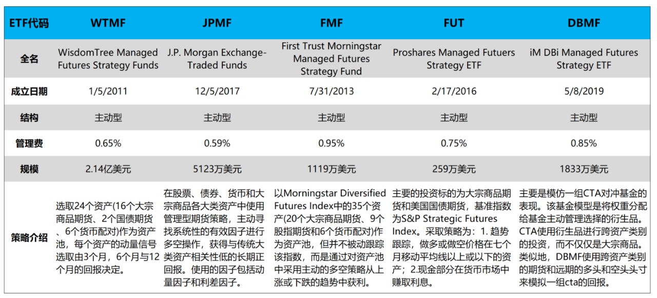 股票和管理型期货搭配 基于上述股债测试的框架,我们使用了以下管理型期货策略ETF,替换国债ETF的头寸: