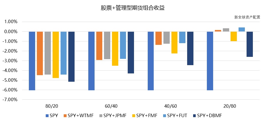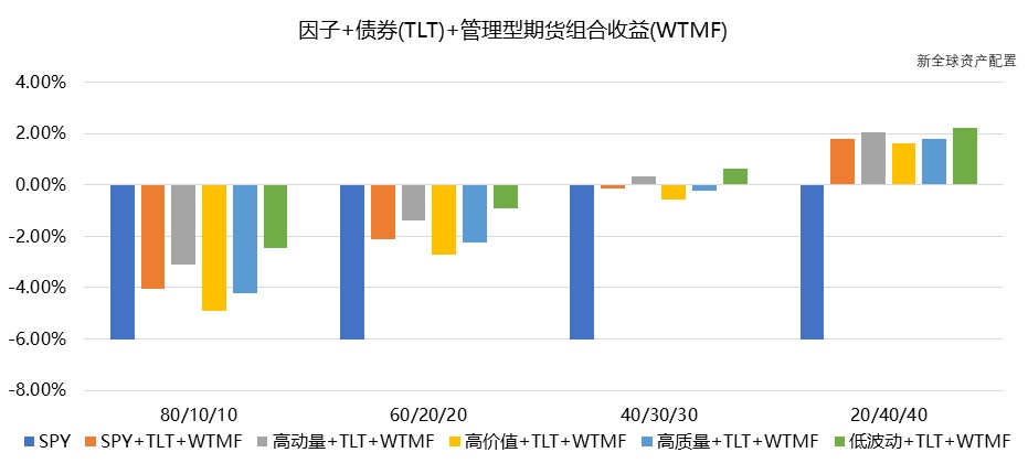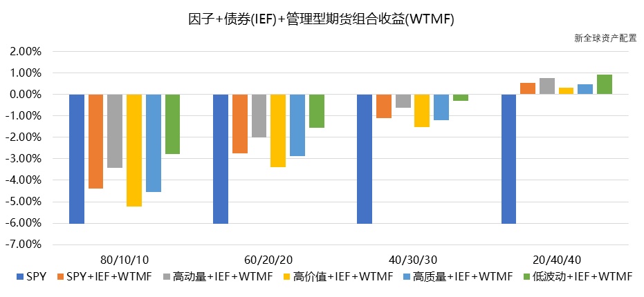 结果显示,不同的管理型期货表现不尽相同,但在与股票进行搭配后都能有效分散股票市场的风险。对于60/40组合,跌幅从6.02%减少到2.8%至4.72%不等。与债券类似,在增加管理型期货ETF的配比后,投资组合对于股票市场风险的暴露会进一步地降低。