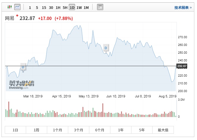 智通财经APP获悉,周四美股开盘,网易(NTES.US)一度上涨逾10%,截止到北京时间21:37,网易涨7.88%,报232.78美元。