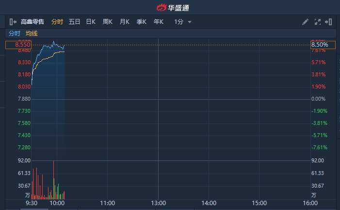 智通财经APP获悉,高鑫零售(06808)于7日发布公告称,中期纯利同比增5%至17.66亿。相比2018年高鑫零售营收、利润双双下滑,本期高鑫零售实现了营收利润双增长。截至发稿,涨8.12%,报8.52港元,成交额7686.66万港元。