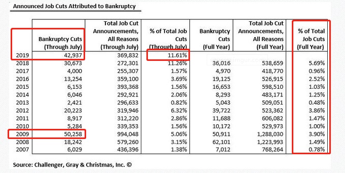 根据报告,截至今年7月,42937名工人因所在公司申请破产而失业,比去年同期宣布的30673破产裁员高出40%,比去年全年宣布的36016人破产裁员高出19%,创下了自2009年前7个月(破产而宣布裁员50258人)以来的新高。事实上,这一数字高于2009年以来每年的破产裁员总数。2009年全年共宣布因破产裁员50911人。