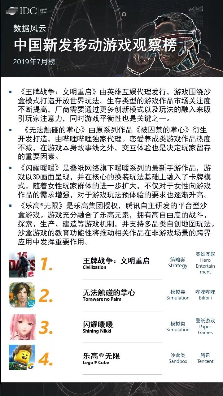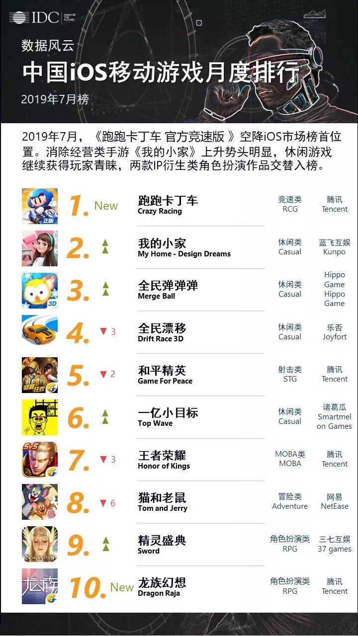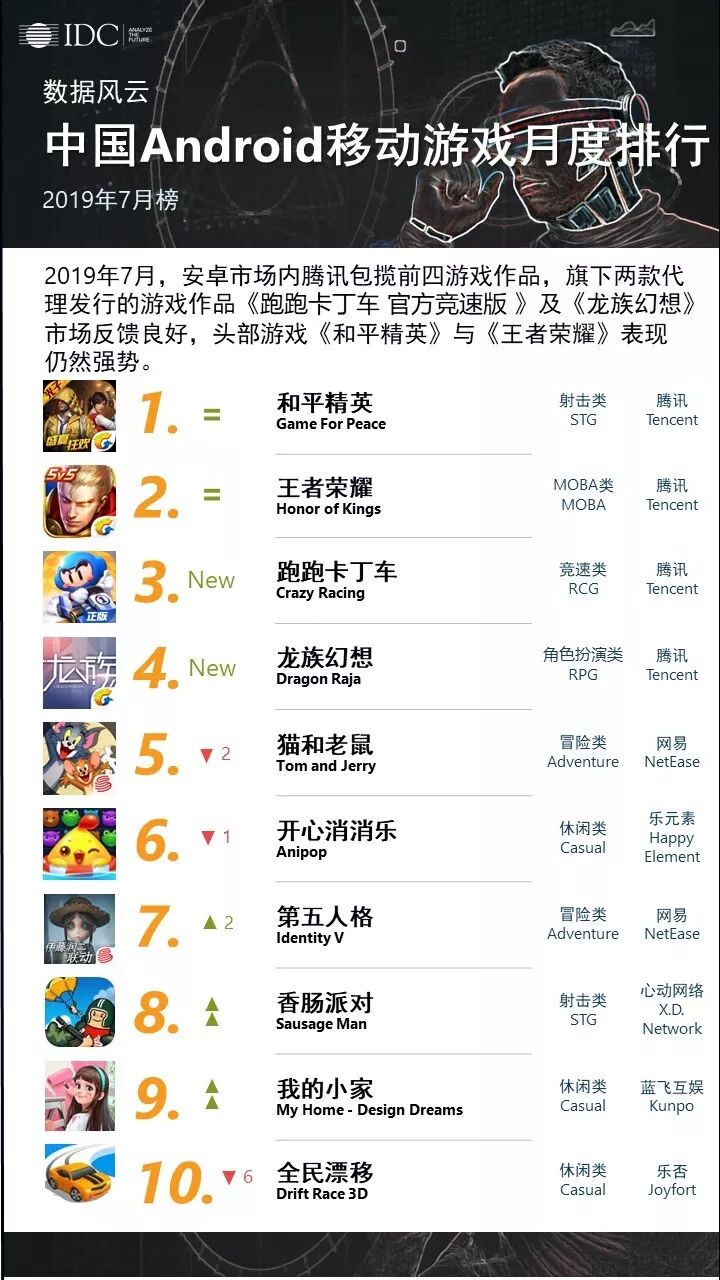 智通财经APP获悉,8月9日,IDC发布2019年7月榜数据显示,《跑跑卡丁车官方竞速版》同时在中国iOS和移动游戏综合月度榜单中位列榜首;《和平精英》夺得中国Android移动游戏月度排行榜榜首;此外,《王者荣耀》、《我的小家》、《猫和老鼠》、《龙族幻想》、《全民漂移》、《开心消消乐》、《全民弹弹弹》、《一亿小目标》在中国移动游戏综合7月排行榜中排名第3-10位。