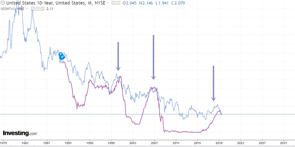 美国十年期债息及三个月债息倒挂