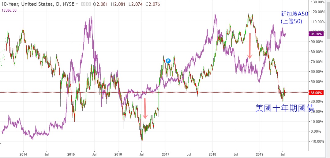 上图是新加坡A50(上证50)及美国十年期国债,美债跟A股的关系:美债上升,股市下跌,主要因为担心美国的缩表。所以目前如果美债持续走低,及欧洲的债息维持在负利率的水平,那么需小心股市向下振荡的可能性。