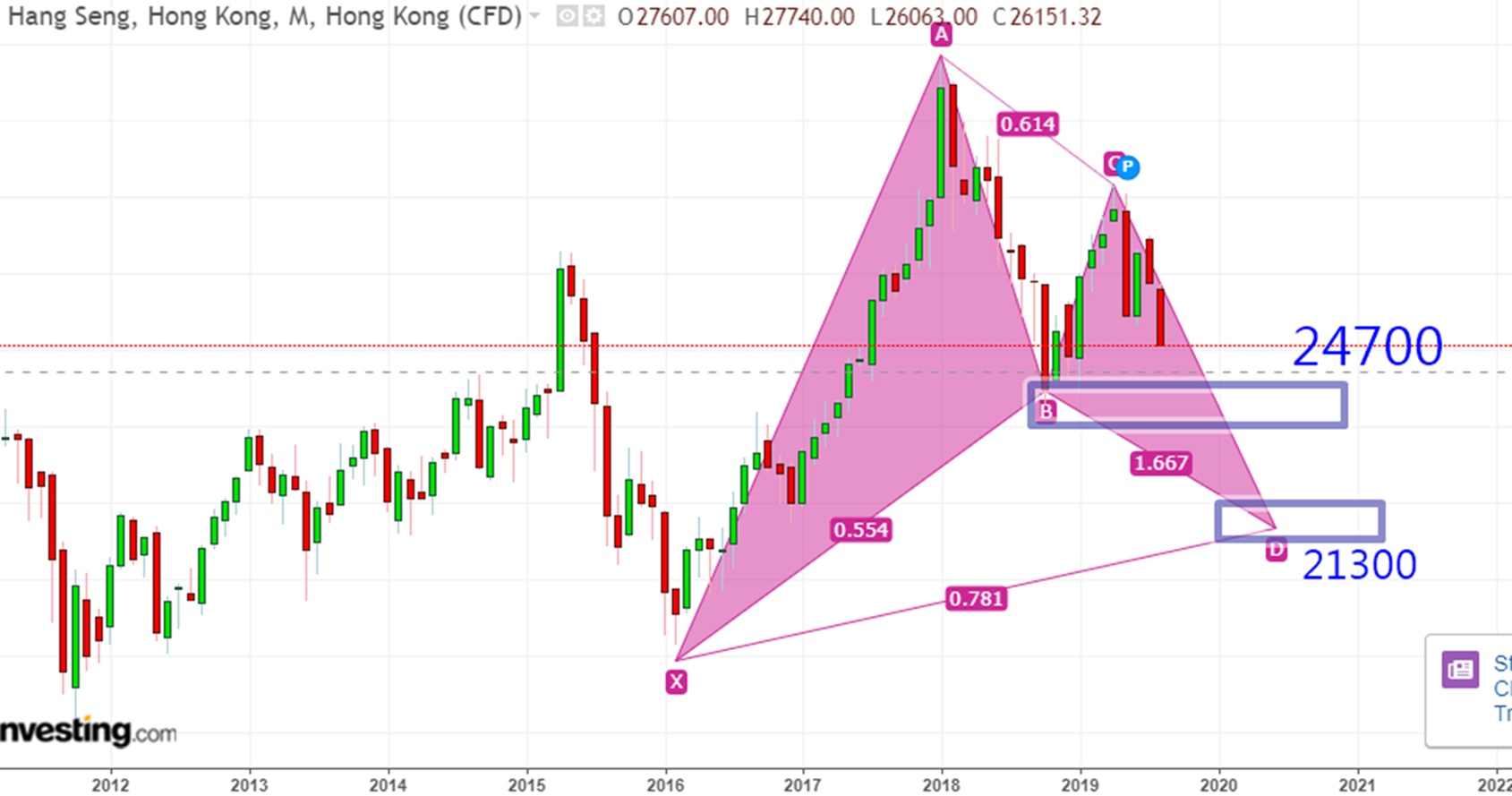 同样得恒生指数一旦跌穿24700点,则有机会跌至22000-21300点。不过应该不会在本月份出现,或可能在10月份出现。本月低点可能会在25000-23500点左右发生。未来股市或在8月向下波动,之后平复一阵,10月可能再来一波。短线留意香港地产股板块,如持续下跌存在投机的机会。下一个江恩转势日在8月13-15日。
