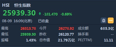 智通财经APP获悉,恒指早盘高开158.15点或0.61%,报26278.92点。截至收盘,恒生指数跌181.47点或0.69%,报25939.3点,全日成交额达685.31亿。国企指数跌0.48%,报9993.84点,红筹指数跌0.19%,报4109.42点。