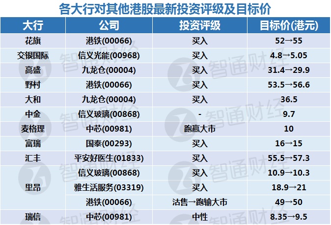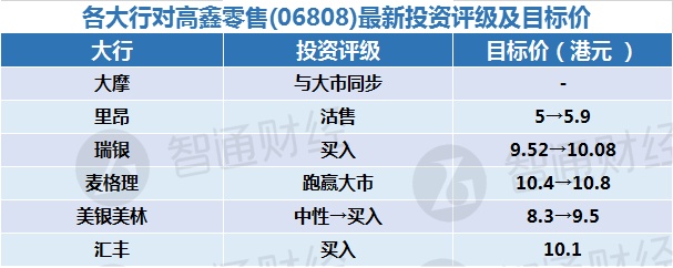 3,各大行对高鑫零售(06808)最新投资评级及目标价: