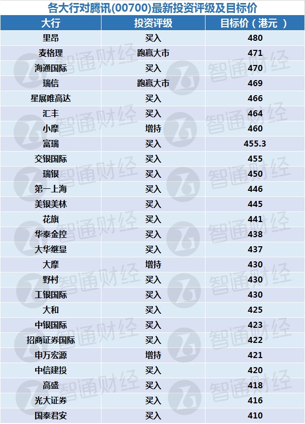 一,各大行对腾讯(00700)最新投资评级及目标价: