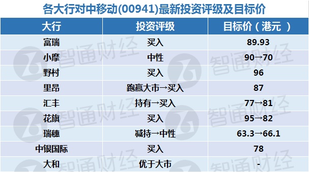 2,各大行对中移动(00941)最新投资评级及目标价:
