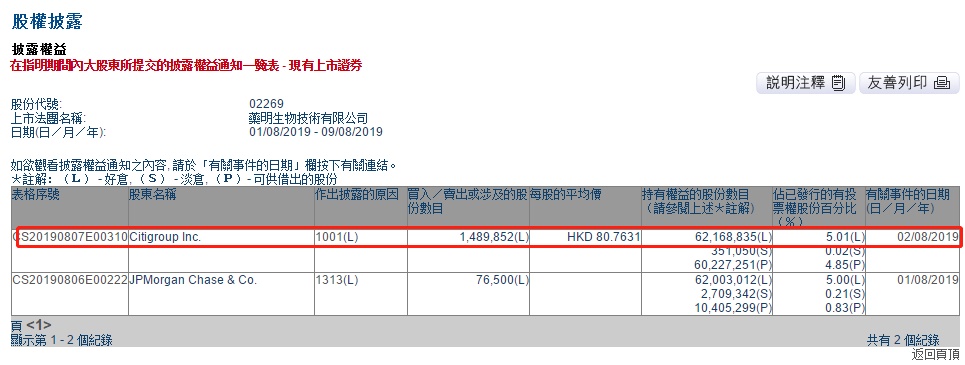 智通财经APP获悉,联交所最新资料显示,8月2日药明生物(02269)获Citigroup Inc.增持约148.99万股,每股作价80.7631港元,总值约为1.2亿港元,最新持股数目约为6217万股,最新持股比例为5.01%。