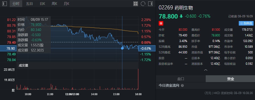 截至今日收盘,药明生物跌0.76%,报78.8港元。