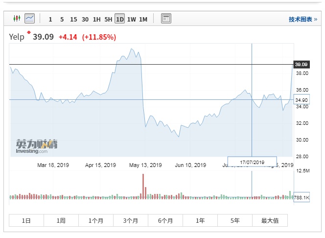 智通财经APP获悉,周五美股开盘,美国点评网站Yelp(YELP.US)大涨逾11%,截止到北京时间21:40,该股大涨11.85%,报39.09美元。