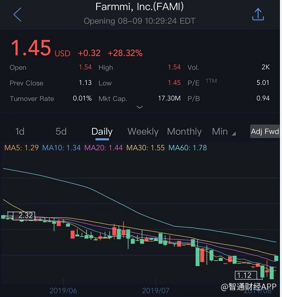 智通财经APP获悉,周五美股盘初,农米良品(FAMI.US)大幅上涨,截止到北京时间22:35,该股涨28.32%,报1.45美元。
