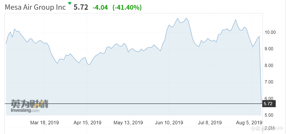 智通财经APP获悉,周五美股盘初,梅萨航空(MESA.US)大幅下跌,截止到北京时间23:05,该股跌41.4%,报5.72美元。
