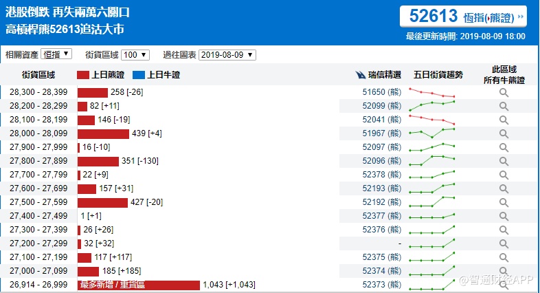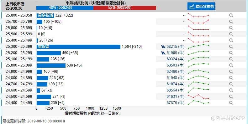 智通财经APP获悉,截至8月9日,恒指最新的牛熊街货比例48:52。瑞信恒指牛熊证街货分布图中的数据显示,熊证街货重货区在26914-26999区间,该区间最新熊证数量为1043张,较上一交易日增加1043张,最多新增在同一区间。牛证街货重货区在25300-25399区间,该区间最新牛证数量为1564张,比上一交易日减少310张;最多新增区间在25800-25858。