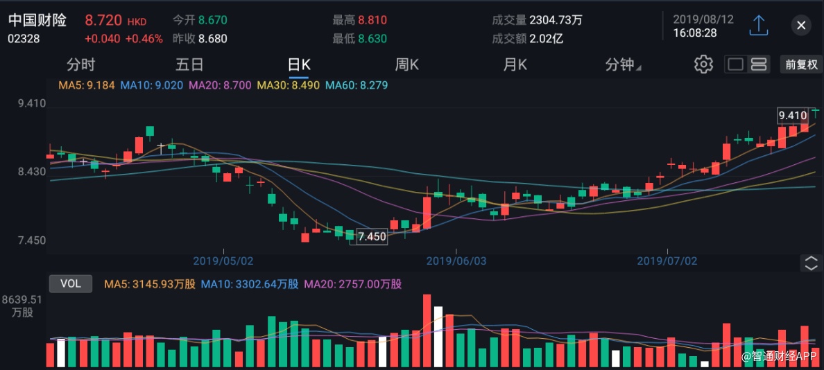 截至今日收盘,财险(02328)涨0.46%,报8.72港元。