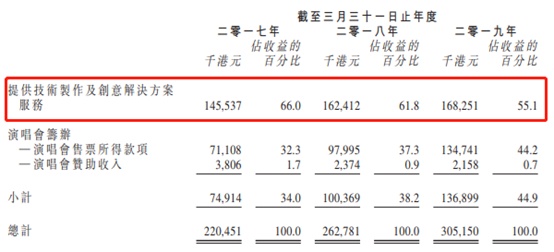 据招股书,公司的主要收入来源是提供技术制作及创意解决方案服务。截至2017年、2018年及2019年3月31日止年度,公司提供技术制作及创意解决方案服务的收益分别约为145.5百万港元、162.4百万港元及168.3百万港元,占同期总收益约66.0%、61.8%及55.1%。