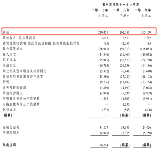 截至2017年、2018年及2019年3月31日止年度,收益分别约为220.5百万港元、262.8百万港元及305.2百万港元,复合年增长率约为17.7%。于往绩记录期间的收益整体增加主要是由于(i)按项目规模划分,为大型及超大型演唱会提供技术制作及创意服务的平均收益增加;(ii)演唱会筹办分部于每场演唱会节目的平均门票销售所得款项增加。