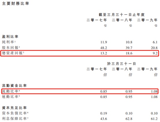 总资产回报由截至2017年3月31日止年度约13.2%增加至截至2018年3月31日止年度约18.6%,主要由于纯利增加,付股息导致总资产减少。总资产回报由截至2018年3月31日止年度约18.6%减少至截至2019年3月31日止年度约9.2%,主要由于净溢利减少,资产总值增加。