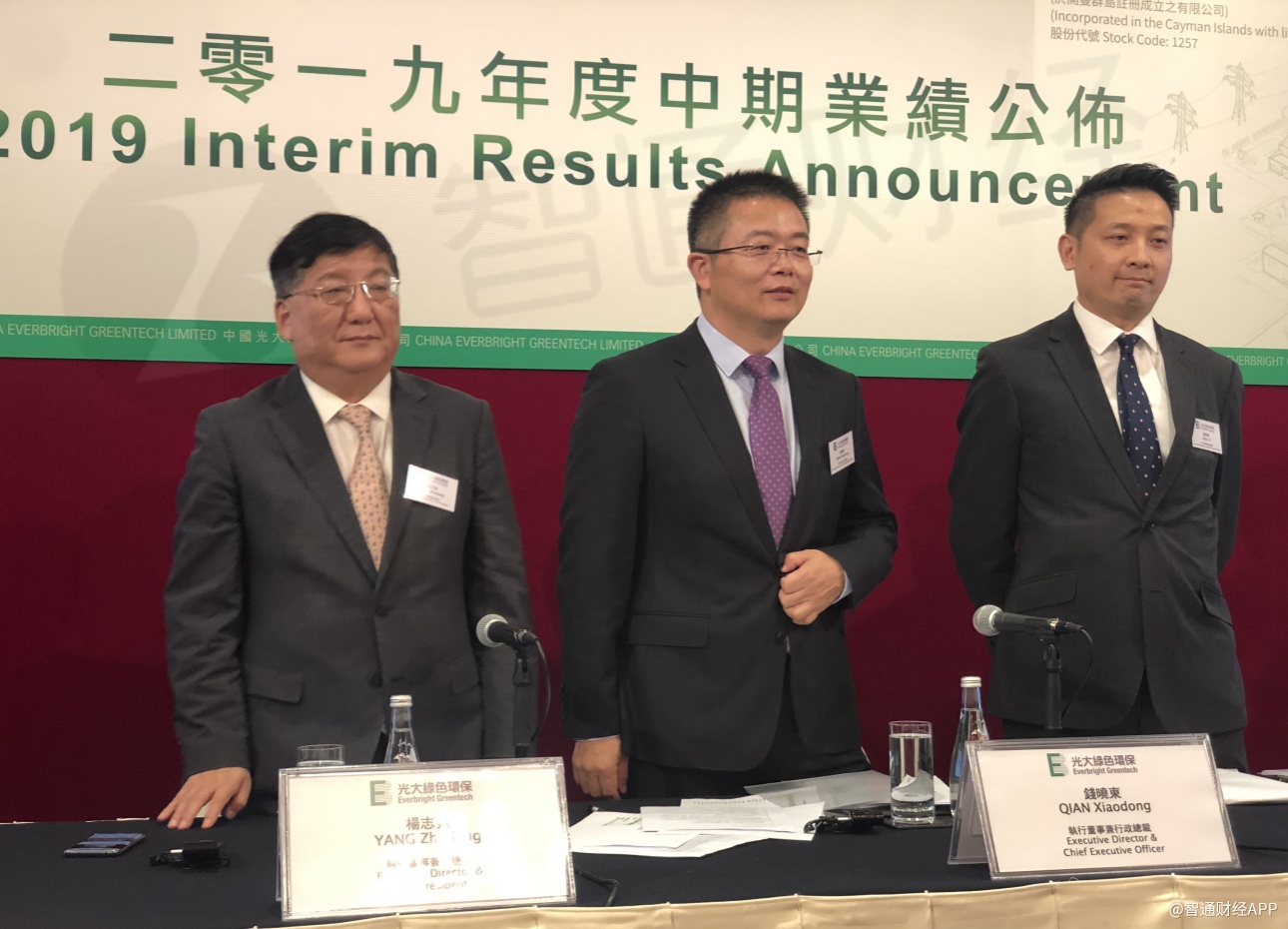 8月12日,中国光大绿色环保有限公司(01257)在香港召开2019年中期业绩会,公司执行董事兼行政总裁钱晓东、执行董事兼副总裁杨志强及执行董事兼财务总监卢锦勋出席本次业绩会。