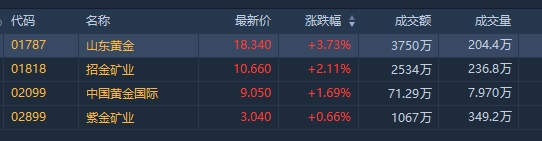 截至9时48分,山东黄金(01787)涨3.73%,报18.34港元,成交额3750万港元;招金矿业(01818)涨2.11%,报10.66港元,成交额2534万港元;中国黄金国际(02099)涨1.69%,报9.05港元,成交额71.29万港元;紫金矿业(02899)涨0.66%,报3.04港元,成交额1067万港元。