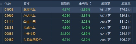 截至10时56分,北京汽车(01958)跌2.89%,报4.37港元,成交额761.2万港元;永达汽车(03669)跌2.81%,报6.58港元,成交额787.7万港元;华晨中国(01114)跌2.23%,报7.02港元,成交额2681万港元;长城汽车(02333)跌1.42%,报4.86港元,成交额2210万港元。