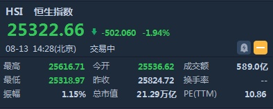 智通财经APP获悉,恒指今日低开低走,午后跌超500点,蓝筹股全线下跌,市场恐慌情绪急剧升温,截至14时28分,跌1.94%,报价25322.66点,成交额589亿。