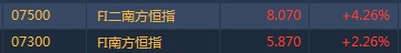 截至发稿,FI二南方恒指(07500)涨4.26%,报8.07港元。FI南方恒指(07300)涨2.26%,报5.87港元。