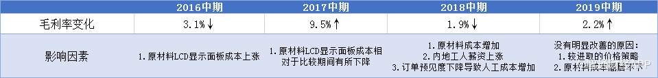 于2019年二季度,智能手机行业产业链未能回稳,小型厂商等供应链企业相继传出资金问题。华显光电虽于今年一季度通过与母公司合作进入一线品牌供应链以及压低利润率获得了更多订单,实现了逆市增长,也难以幸免于行业下滑所带来的负面影响,从而被动采取更为进取的定价策略。