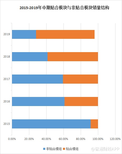 2015-2019年中期,贴合LCD模组产品销量占比逐年提升,2019年上半年,公司贴合模组销量占比达68.10%,这一数字在2015年仅为8.70%。相比之下,非贴合模组销量占比由15年中期的91.30%下降至19年中期的27.90%。