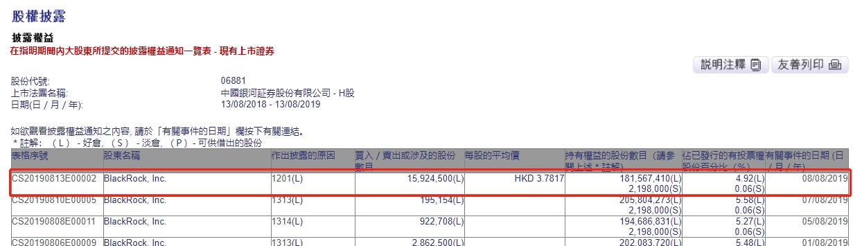 智通财经APP获悉,联交所最新资料显示,8月8日,贝莱德(BlackRock, Inc.)减持中国银河(06881)1592万股,每股作价3.7817港元,涉及总金额约为6020万港元。减持后最新持股数目约为1.81亿股,最新持股比例为4.92%。