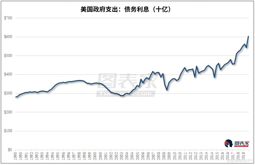 智通财经APP获悉,截至2019年6月,公众持有的联邦债务为16.17万亿美元,政府间持有的债务为5.86万亿美元,国债总额为22.03万亿美元。截至2019年7月,美国1年累计债务已经达到了9620亿美元(略低于1万亿),并且,债务增长没有丝毫放缓的迹象。美国财政部称,从2024年开始所有美国发债将用于支付美国净利息费用。根据计算,届时利息支出将达到7000亿-1.2万亿美元之间。