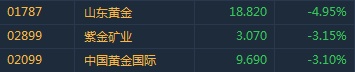 智通财经APP获悉,市场情绪大幅提振,国际金价高位回调,港股黄金股全线走弱,领跌大市。截至9时37分,山东黄金(01787)跌4.95%,报价18.82港元,紫金矿业(02899)跌3.15%,报3.07%,中国黄金国际(02099)跌3.1%。