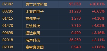 智通财经APP获悉,受惠于舜宇光学(02382)中报超预期,提振市场情绪,手机产业链全线走强。截至9时58分,涨舜宇光学(02382)涨10.01%,报价95.05港元,比亚迪电子(00285)涨6.65%,高伟电子(01415)涨4.1%,丘钛科技(01478)涨4.05%,通达集团(00698)涨3.16%。