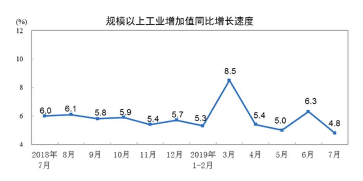 智通财经APP获悉,国家统计局今日公布,2019年7月份,规模以上工业增加值同比实际增长4.8%(以下增加值增速均为扣除价格因素的实际增长率),比6月份回落1.5个百分点。从环比看,7月份,规模以上工业增加值比上月增长0.19%。1-7月份,规模以上工业增加值同比增长5.8%。