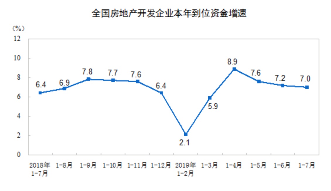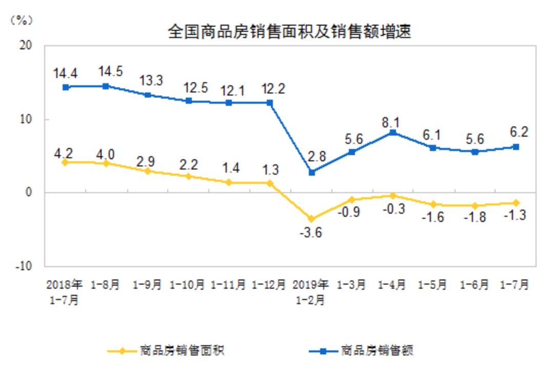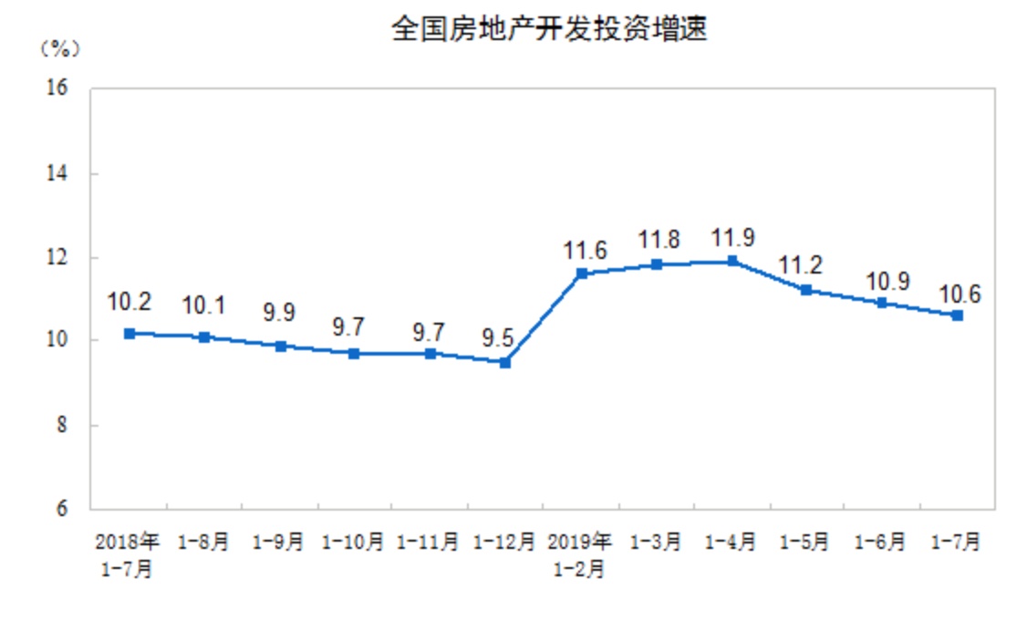 智通财经APP获悉,国家统计局今日公布,2019年1-7月份,全国房地产开发投资同比增长10.6%,商品房销售面积同比下降1.3%,房地产开发企业到位资金同比增长7.0%。7月份,房地产开发景气指数(简称“国房景气指数”)为100.90,比6月份回落0.01点。