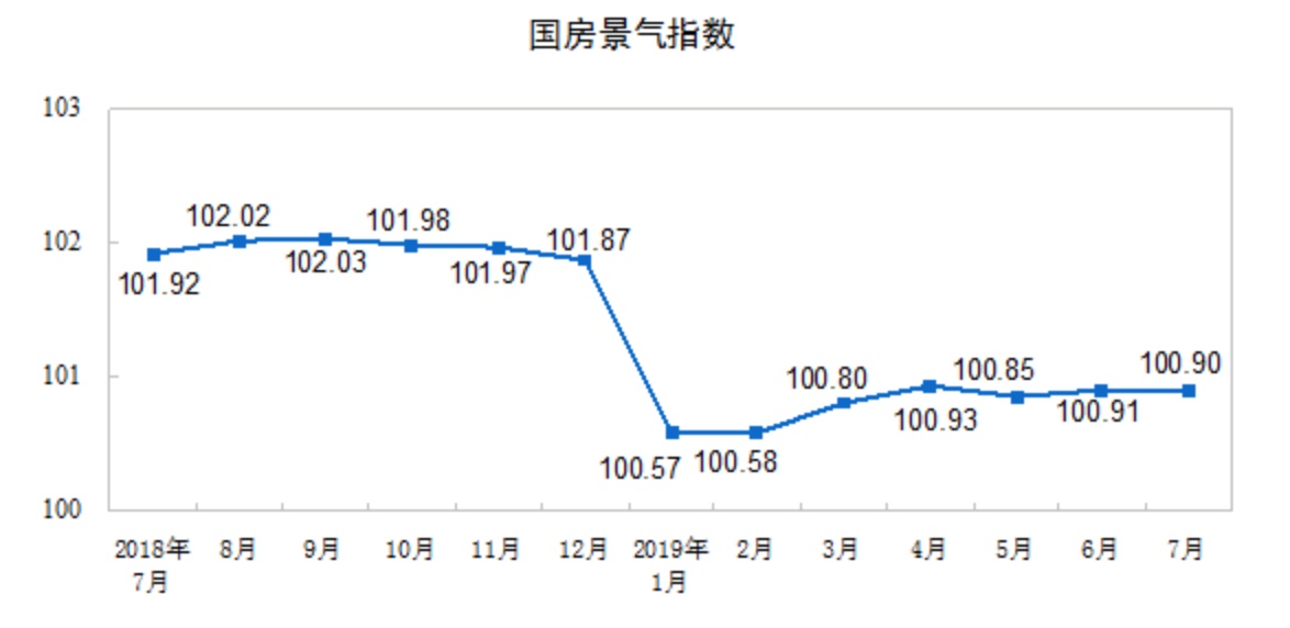 7月份,房地产开发景气指数(简称“国房景气指数”)为100.90,比6月份回落0.01点。