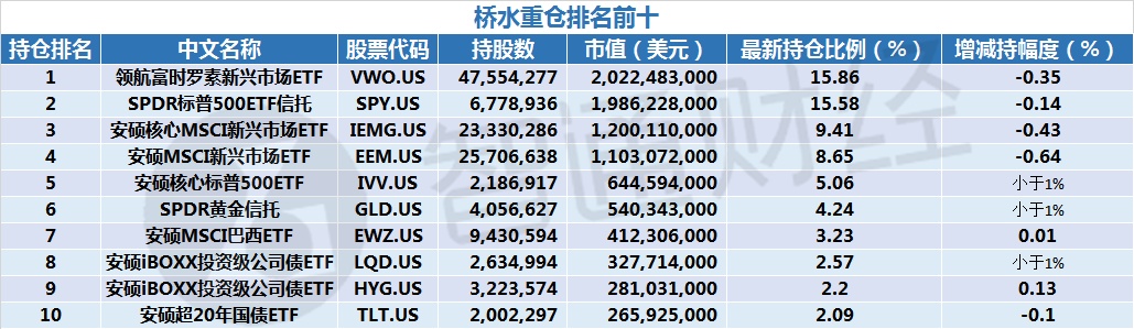 与此同时,桥水对“SPDR黄金信托”(GLD.US)进行了小幅加仓,对“安硕MSCI巴西ETF”(EWZ.US)加仓1%,以及对“安硕iBOXX投资级高收益公司债ETF”(HYG.US)大幅加仓13%。
