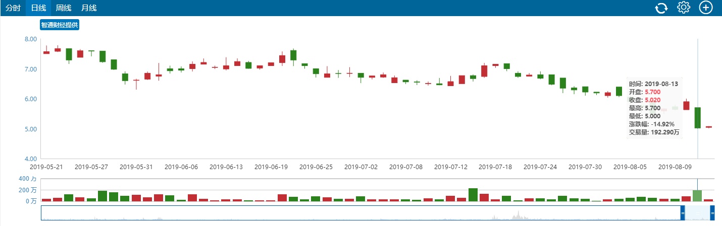 一看同比营收同比只增长了3.6%,13日,该股在竞价盘就被人“砸盘”,一根阴线打到底,20分钟跌破12%,收盘跌近15个点,报5.02元,市值一天被削掉5个亿。光看大阴线,还以为“被沽空”了。