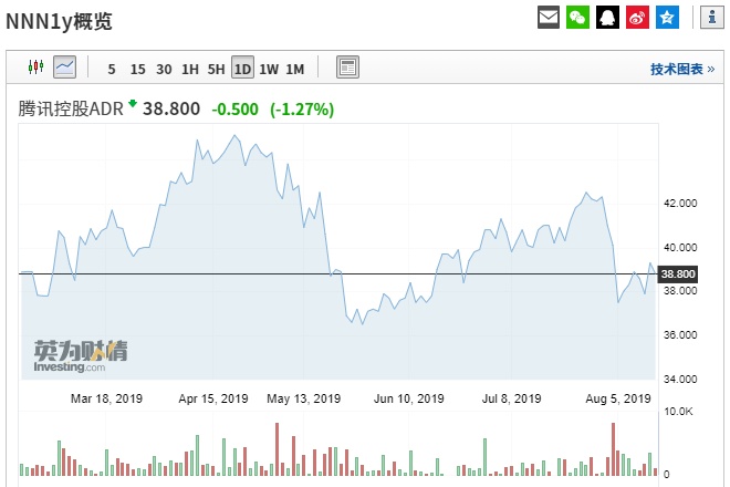 智通财经APP获悉,周三(8月14日),腾讯(00700)盘后公布最新业绩报告。第二季度腾讯权益持有人应占盈利超过市场预期,德国法兰克福市场上,腾讯控股ADR回补今日少量跌幅。截至17:40,报38.8欧元,跌1.27%。股价折合340.32港元,相对于港股收盘价340港元微弱上涨。