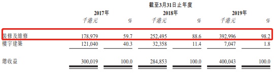 公司的主要收入来源是装修及维修工程业务,截至2017年、2018年及2019年3月31日止年度,该业务的收益分别约为1.79亿港元、2.52亿港元和3.93亿港元,分别占总收益比重约 59.7%,88.6%及98.2%。
