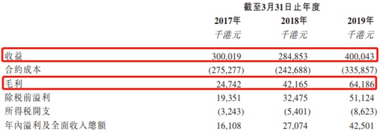 截至2017年、2018年及2019年3月31日止年度,该公司的总收益分别约为3.00亿港元、2.86亿港元及4.00亿港元;毛利分别约为2474万港元,4217万港元及6419万港元。