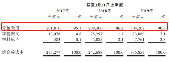 分包费用是该公司总合约成本的主要构成类目,截至2017年、2018年及2019年3月31日止年度,富霆的分包费用分别占公司合约总成本约95.1%、86.2%及90.6%。
