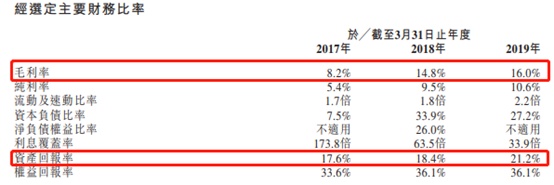 截至2017年、2018年及2019年3月31日止年度,公司的毛利率分别是8.2%、14.8%和16.0%;资产回报率分别是17.6%、18.4%和21.2%。