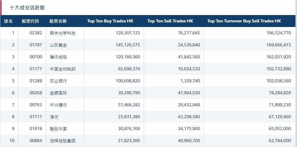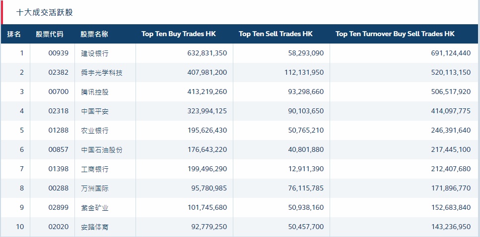 港股通(沪)十大活跃成交股