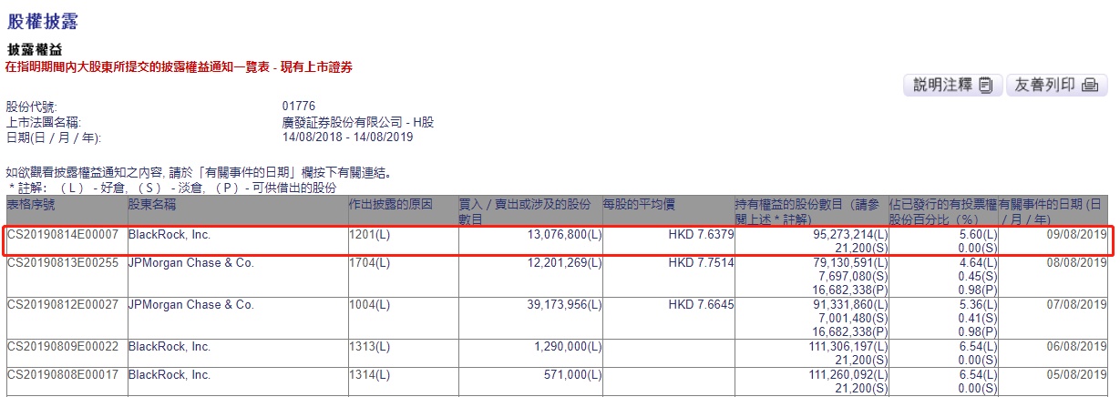 智通财经APP获悉,联交所最新资料显示,8月9日,贝莱德(BlackRock, Inc.)减持广发证券(01776)1308万股,每股平均价7.6379港元,涉及总金额约为9990万港元。减持后最新持股数目约为9527万股,最新持股比例为5.6%。