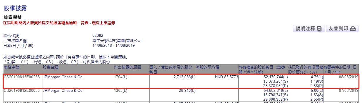 智通财经APP获悉,联交所最新资料显示,8月8日,摩根大通减持舜宇光学(02382)271万股,每股作价83.5773港元,涉及总金额约为2.26亿港元。减持后最新持股数目约为5217万股,最新持股比例为4.75%。