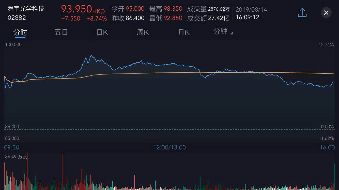 截至今日收盘,舜宇光学科技(02382)涨8.74%,报93.950港元。