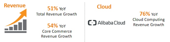 回顾上一季度,阿里巴巴营业收入同比增长51%至935亿人民币(约和139亿美元),高于市场预期的916.8亿美元。非公认会计准则(non-GAAP)下的每股收益(EPS)为8.57元人民币(约1.28美金),超过市场预期的0.75美金,去年同期为5.73元人民币,同比增长50%。