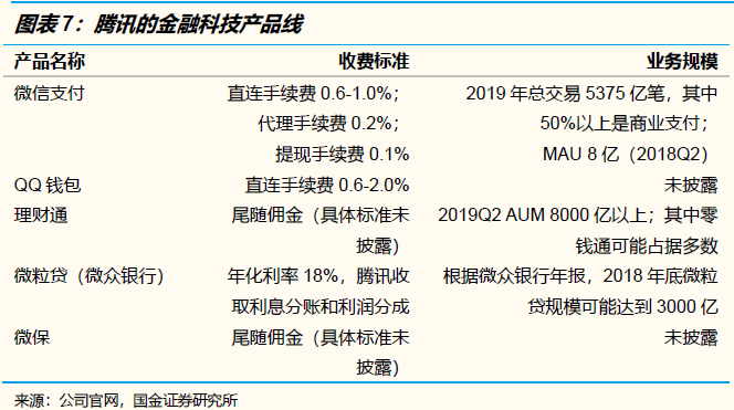 微信支付不但可以贡献大量的佣金收入,而且是更多、更高附加值的金融业务的基础:理财通(包括零钱通)2019年二季度的总规模突破8000亿元;根据微众银行财报,我们估计微粒贷在2018年底的规模接近3000亿元;微保(保险代理)于2017年底获得牌照,目前尚未放量,但是规模做大只是时间问题。由于监管要求,腾讯不能从事表内金融业务,也难以取得境内银行、券商、基金公司的控股权;但是,腾讯仍然能对金融机构提供导流、风险管理等服务,创造巨大的附加值。